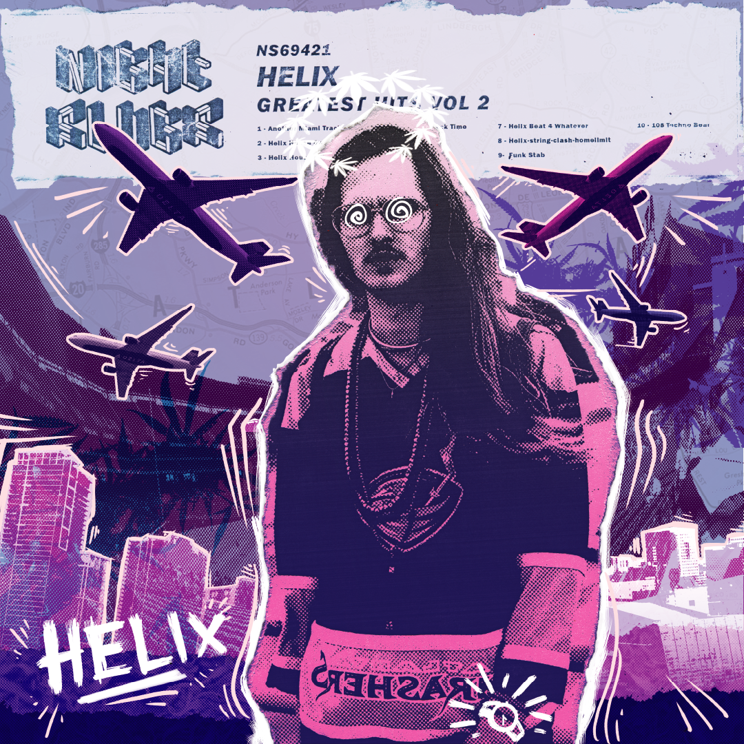 Collection of album covers done for DJ Helix. These covers were made by processing photos of the artist, printing, crumpling and re-scanning them before adding them into a digital collage of similarly processed stock images. Lastly they were decorated with additional drawings.